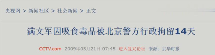 《满文军因吸食毒品被北京警方行政拘留14天》(央视网)