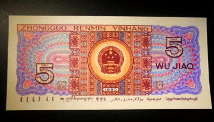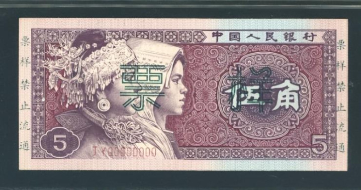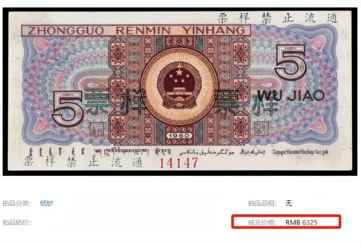 今天先容的这张1980年的五角纸币,它的拍卖价钱达到了6325元,翻了12650倍以上。这张纸币之是以会有这样高的价钱,是因为它的票面上多了两个汉字票样。