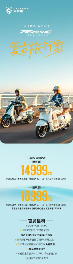 当守旧好意思学再会智能科技,赛科龙 RT250E 这款 “守旧旅民众” 正重新界说 250 级守旧踏板的价值标杆。摩登版14999元,智境版16999元。