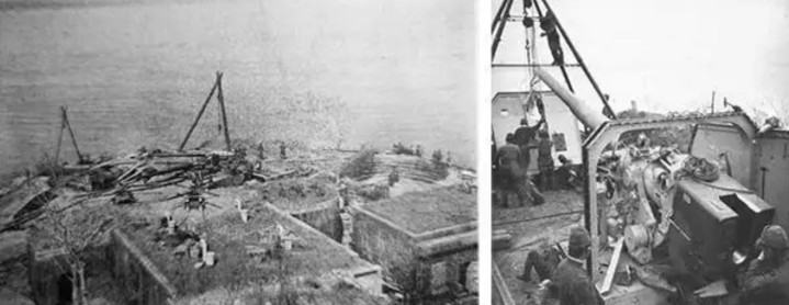 正在被日军拆卸的江阴要地SK C/28炮台全景及拆卸中的火炮