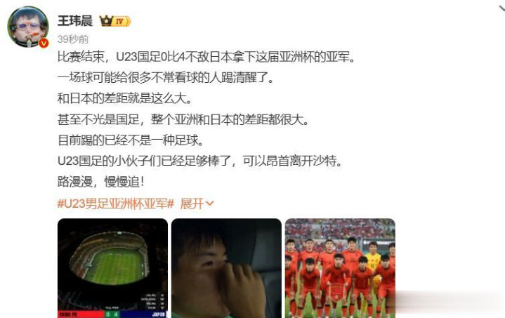 媒体东说念主王玮晨也细则了国足的收成,球员们也曾很棒,不错抬头离开沙特,不外国足和日本如实有比拟大的实力差距,致使悉数亚洲和日本的差距王人很大,当今踢得也曾不是一种足球了!