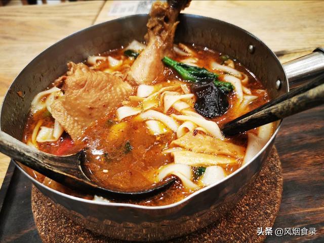 面条得擀得像纸相同薄,煮出来要筋谈透亮;汤必须是热的(煎)、汤多面少(稀)、油要汪得红亮。