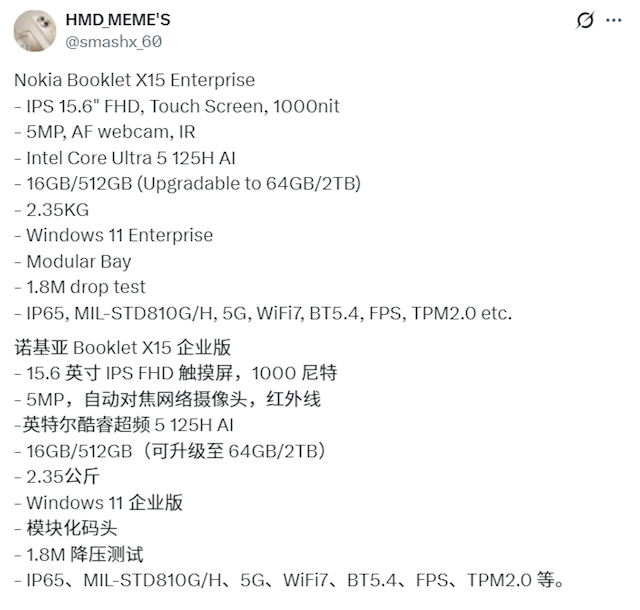 快科技4月15日音书,继曝光诺基亚Mission-Safe Phone 2三防手机后,smashx_60又走漏了诺基亚Booklet X15 Enterprise三防条记本的首张渲染图和厚爱规格。