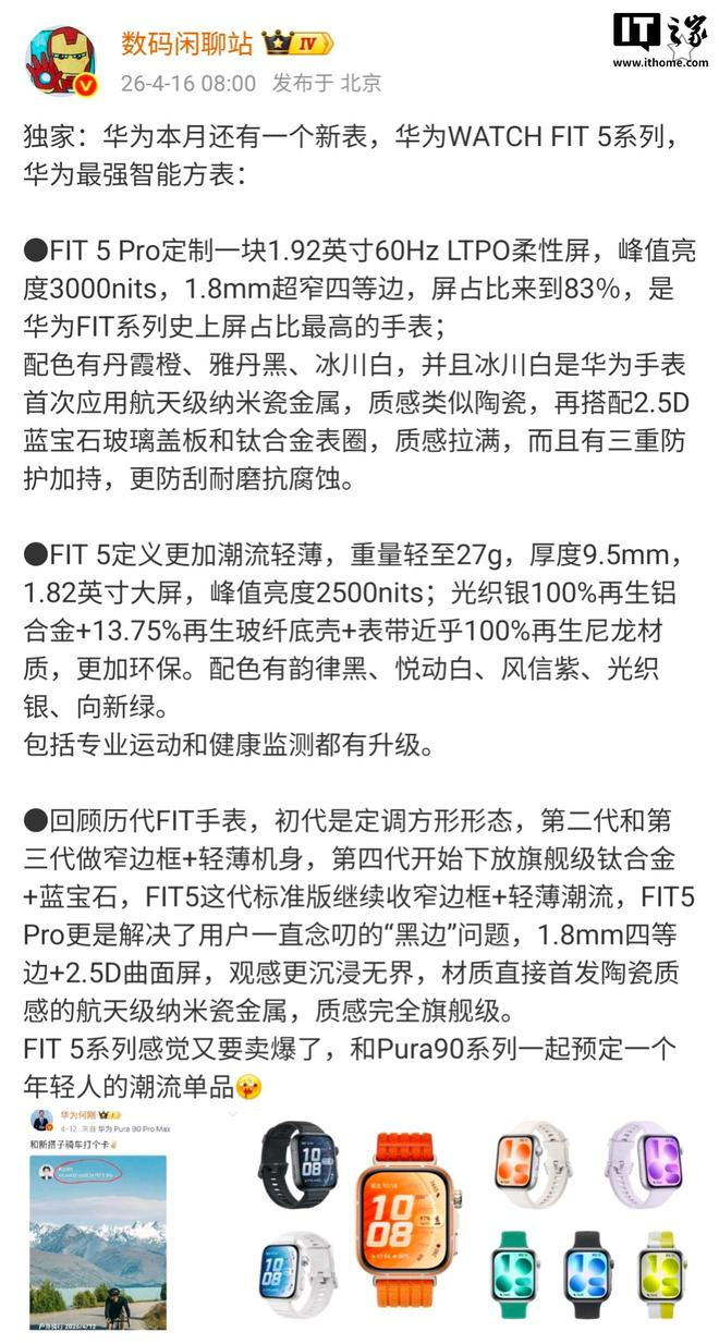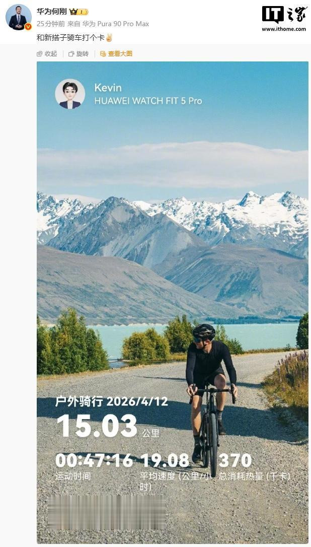 IT之家瞩目到,华为末端BG首席实际官何刚4月12日发布微博:“和新搭子骑车打个卡”,配图中出现HUAWEIWATCHFIT5Pro的称号,示意新品行将发布。