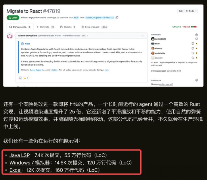 数据都很夸张,AI我方不停地写了55万行代码、120万行代码和160万行代码。(话说,Excel代码比Windows还多点,因吹斯汀)