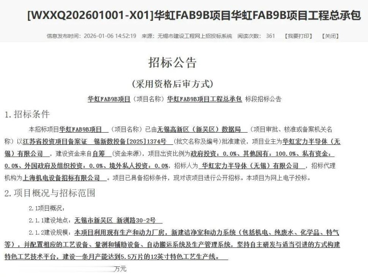 据无锡市宇宙资源交游平台官网近日露出,华虹Fab9B技俩招标已开启。