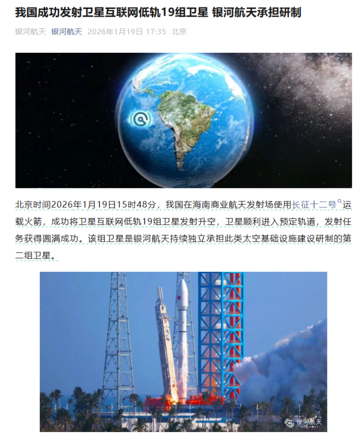 IT之家审视到,星河航天已收效辐射自主研制的40余颗本领先进的卫星。2026年1月19日15时48分,我国在海南买卖航天辐射场使用长征十二号运输火箭,收效将卫星互联网低轨19组卫星辐射升起,卫星凯旋插足预定轨谈,辐射任务取得圆满收效。该组卫星是星河航天捏续落寞承担此类天际基础要领成立研制的第二组卫星。