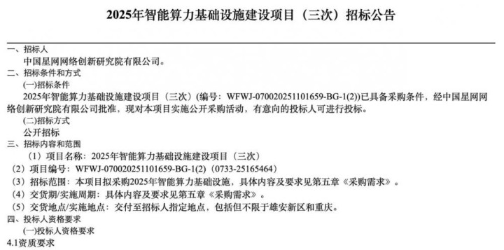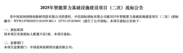 时隔一个多月,2026年1月21日,中国星网发布2025年智能算力基础形式建造状貌(二次)流标公告,原因是“本状貌有用投标东谈主数目不及3家”。