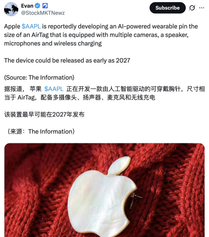 近日,有音问传出,苹果正在研发一款由 AI 动手的可穿着「胸针」(Pin)缔造,不外当今该缔造仍处于早期研发阶段,最快可能也要在 2027 年才能面世。