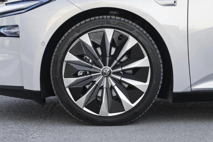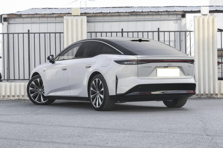 侧面来看,丰田铂智7造型修长,带有荫藏式门把手、大溜背,加向前后隆起的轮眉,营造出了较为畅通激进的车身姿态。尺寸方面,丰田铂智7的长宽高分手为:5130/1965/1506mm,轴距为3020mm,定位中大型轿车,个头大小比拟于比亚迪汉基本上大了一圈。