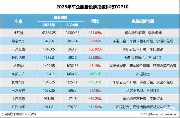 2025年,车企工作举座投诉指数高达102377.6,同比飙升了80.95%。这背后,比亚迪成了2025年度工作投诉指数飙升的“饱和主力”。其一家工作投诉指数便占到了62%。从年度车企工作投诉指数排名TOP10来看,大部分上榜车企的工作投诉指数皆出现了高涨。举座来看,降价增配、不退订金、车机卡顿不升级等老问题是车企上榜的宽阔原因。