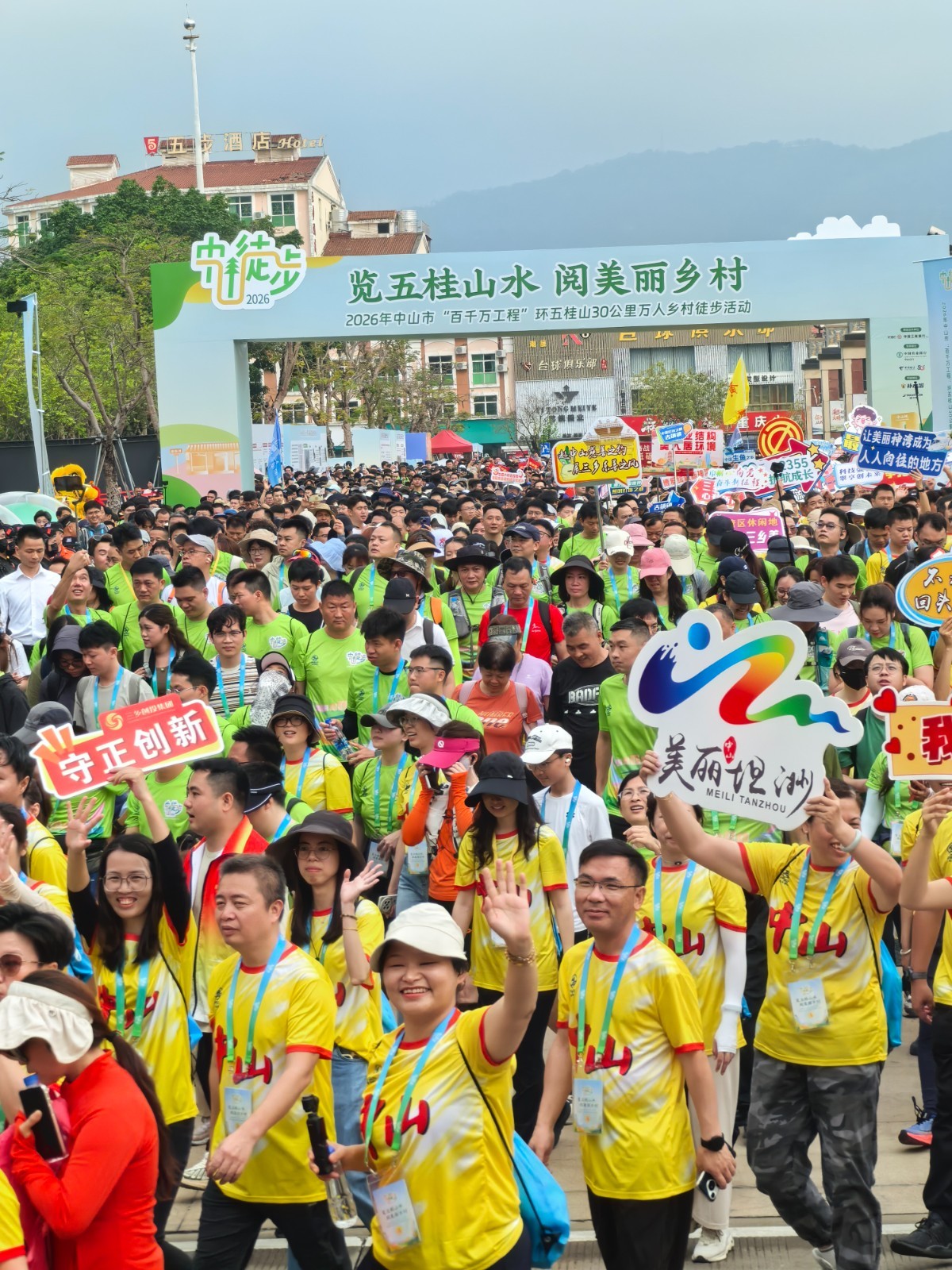 万东谈主乡村徒步手脚行将运行,近万名来自粤港澳大湾区的徒步疼爱者皆聚三乡文化广场。