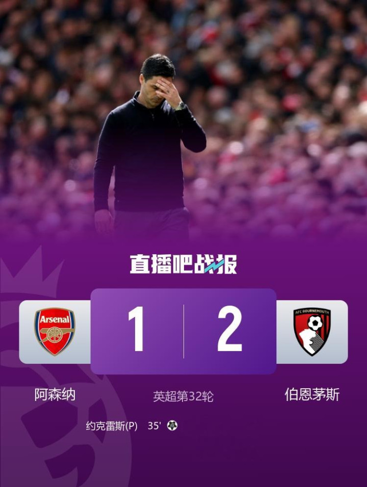 约克雷斯点射,阿森纳1-2不敌伯恩茅斯,四连胜遭闭幕。