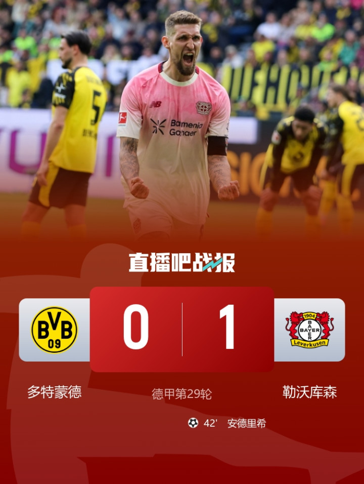 安德里希远射破门,最终多特主场0-1不敌勒沃库森。