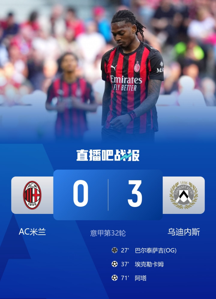 巴尔泰萨吉乌龙,AC米兰0-3不敌乌迪内斯。
