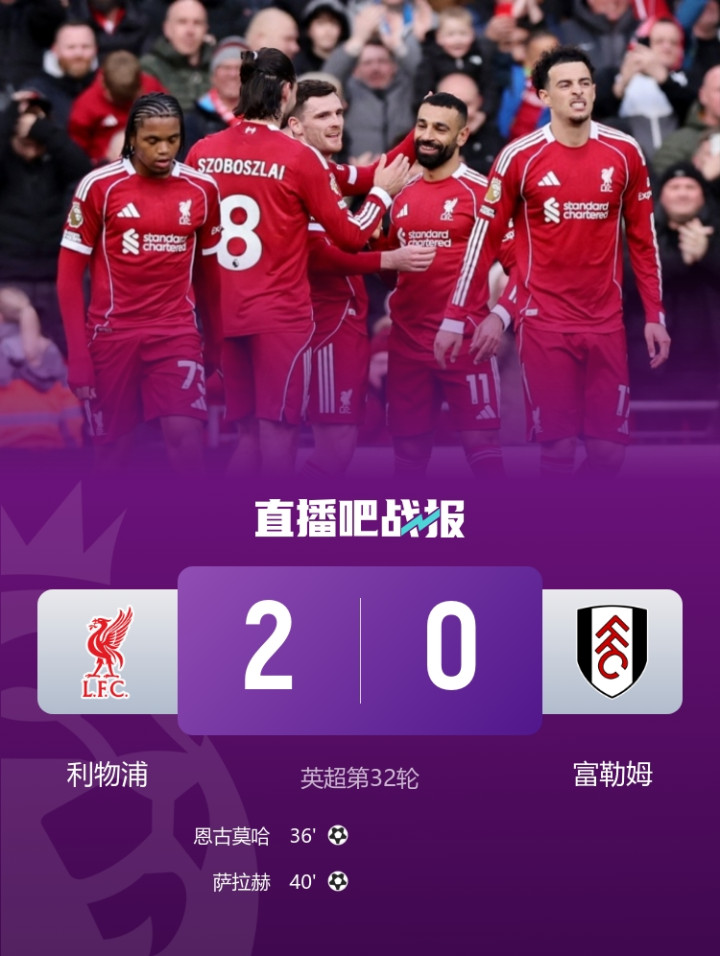 恩古莫哈精彩兜射破门,萨拉赫立功,利物浦主场2-0打败富勒姆,闭幕各项赛事3连败。