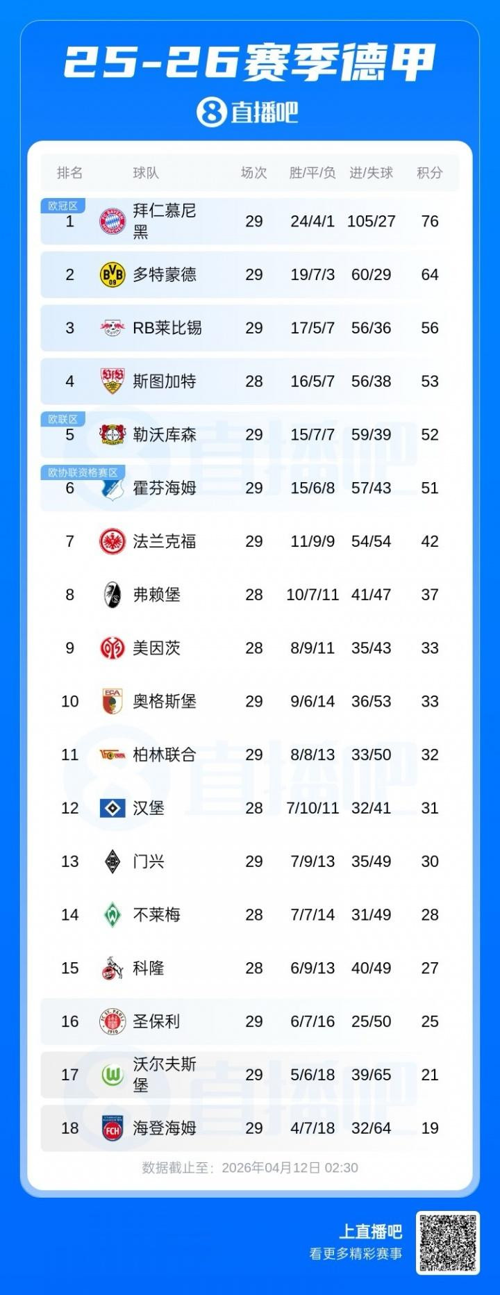 多特不敌勒沃库森,拜仁打败圣保利。拜仁在剩余5轮的情况下照旧跳跃12分,夺冠在望。