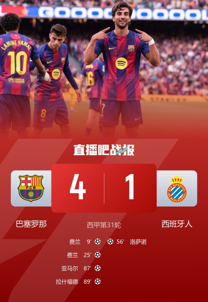 9分领跑!巴萨4-1西班经纪东说念主联赛7连胜亚马尔1射2传费兰双响破球荒