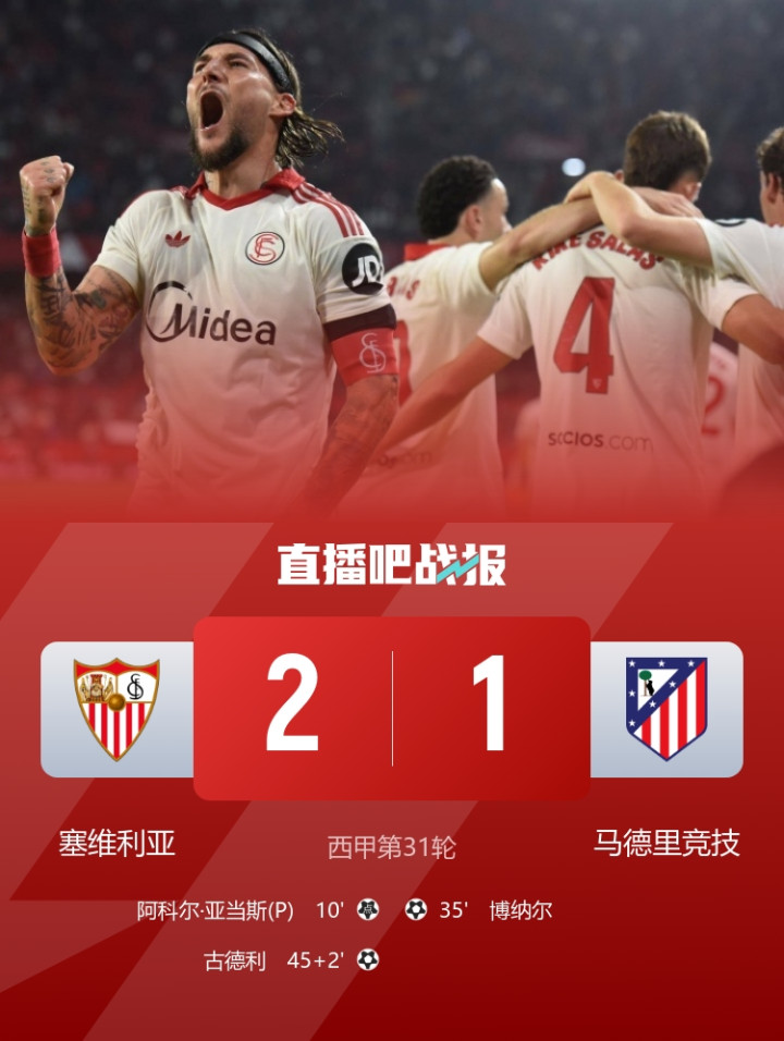 博纳尔首秀破门,塞维利亚2-1驯顺马竞。塞维利亚获得近6轮联赛首胜,积34分逃离左迁区。