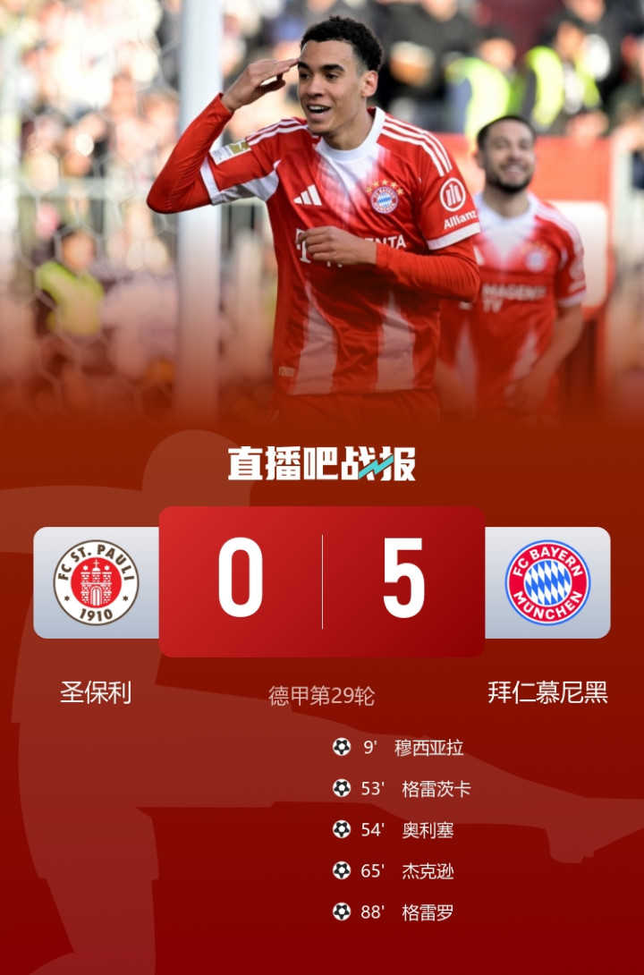 夺冠在望!拜仁5-0圣保利剩5轮跳跃12分+破进球记载穆西亚拉传射