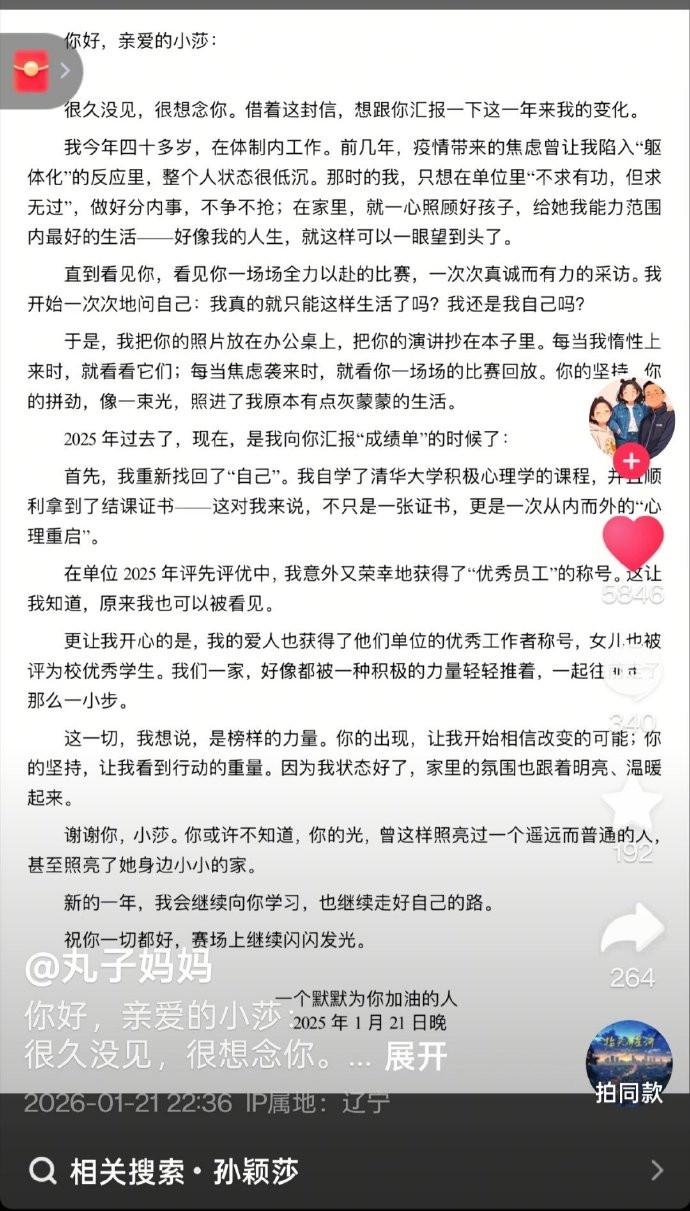 抢庄牛牛 榜样的力量, 孙颖莎粉丝写信本体感动全网: 她像一束光照亮通盘东谈主