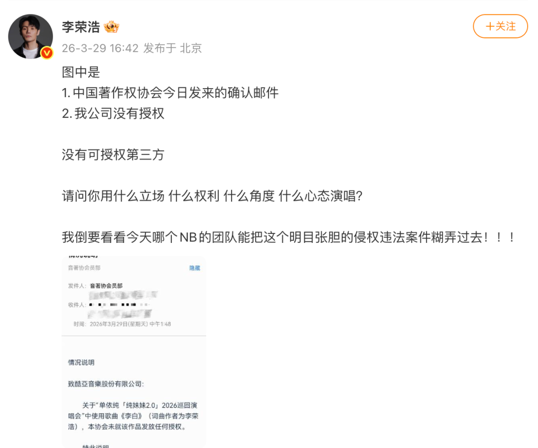 随后,李荣浩再次发文,证明中国文章权协会莫得就《李白》披发任何授权。李荣浩四连责难单依纯:“求教你用什么态度、什么权柄、什么角度、什么心态演唱?”