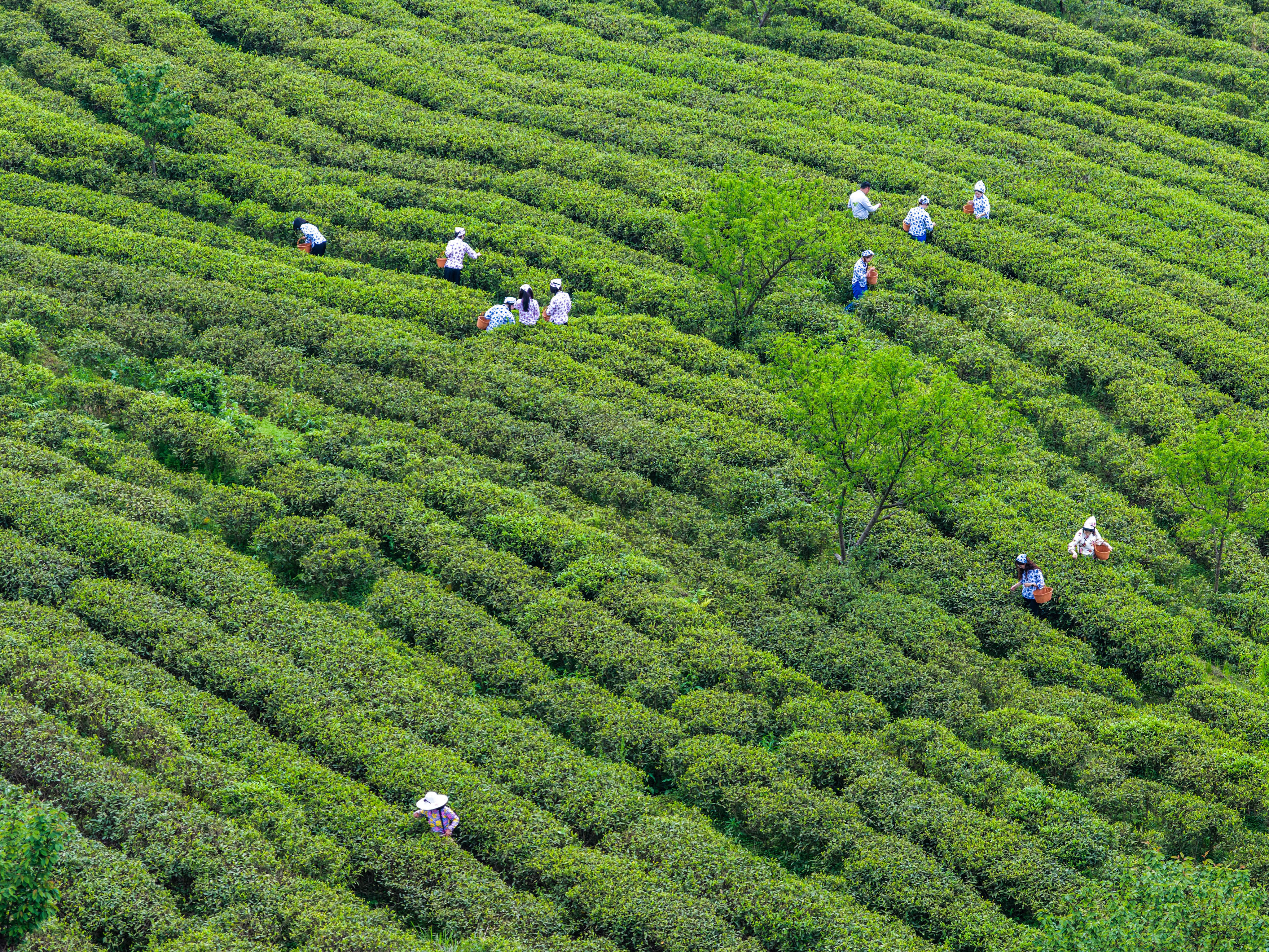 4月9日,茶农在青龙乡茶叶基地内采摘春茶(无东说念主机相片)。