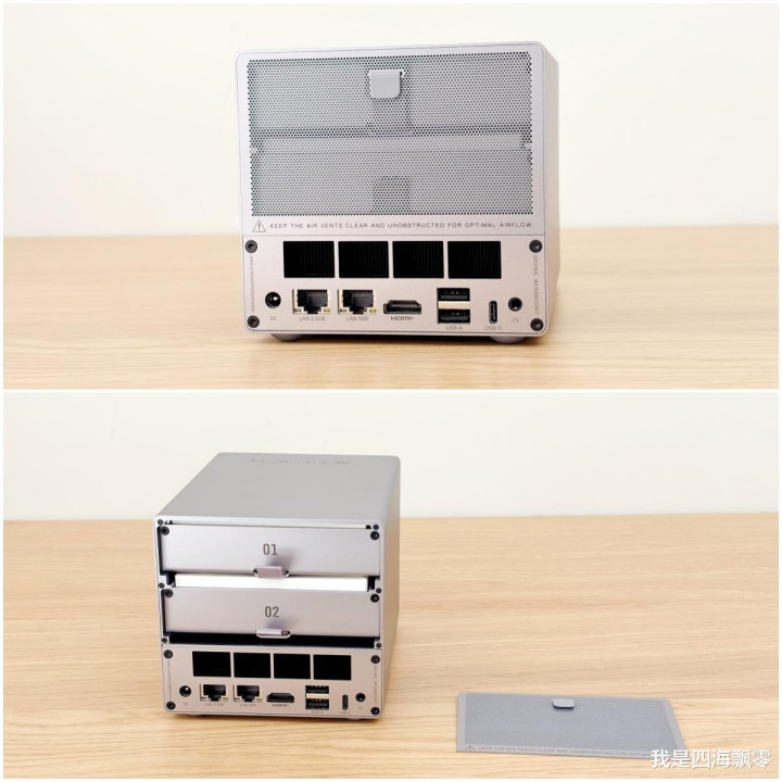 零刻 Me Pro最奥密的联想,当属它创举的铝合金一体成型硬盘仓位支架。硬盘仓位支架遴荐了和机身疏导的铝合金材质,并且不同于传统NAS,Me Pro平直用内六角螺丝锁死固定的格局,有用幸免了机械硬盘被不测拉扯败落的问题,在安全性上更胜一筹。此外,硬盘仓位上方还配备了一块磁吸式的铝合金网孔金属S挡板,既能防尘,又能扶直散热。