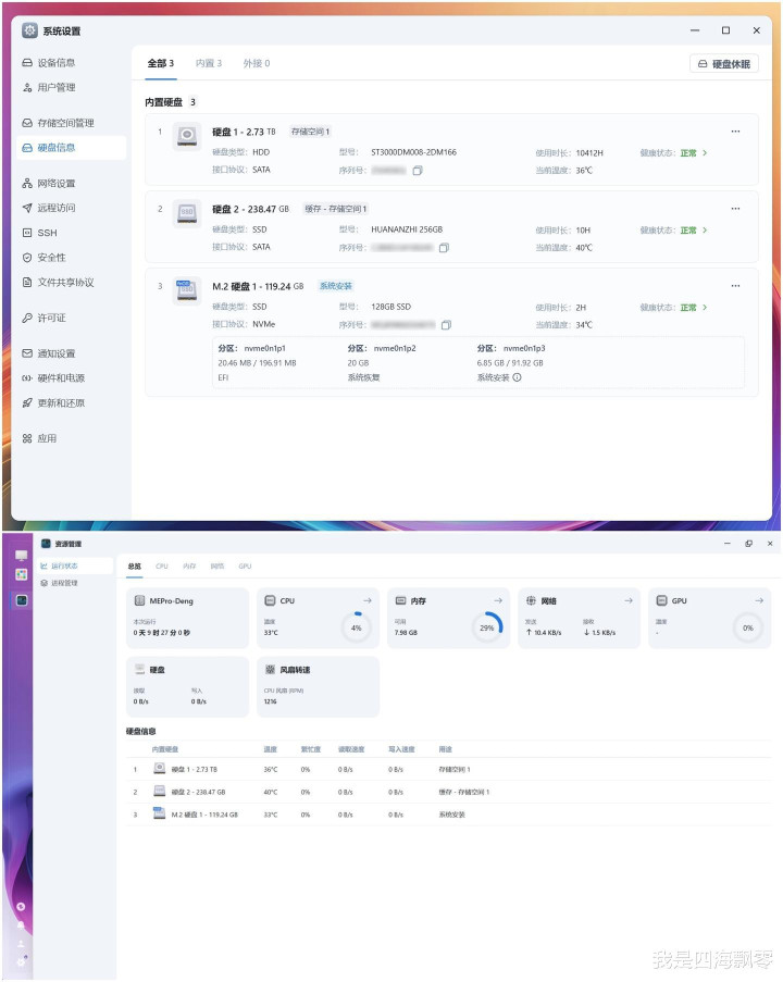 如果不心爱用号令去操作,不错平直在飞牛 fnOS系统里通过系统设立检察硬盘信息或者通过资源处分检察驱动气象,这里会透露CPU处理器温度、电扇转速、硬盘温度信息。