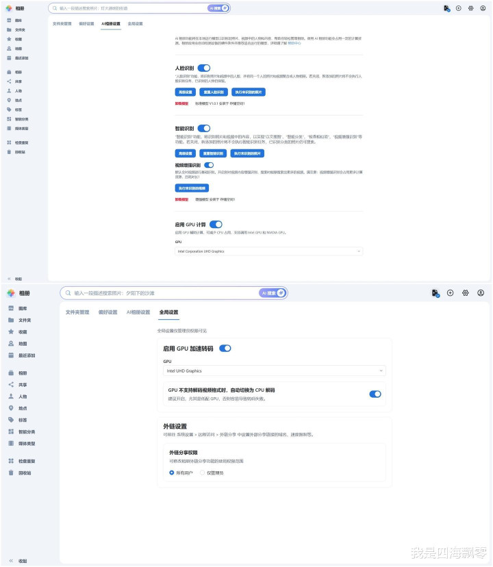 在飞牛 fnOS系统里启用GPU计较,开启东说念主脸识别、智能识别,这么不错有用镌汰CPU处理器的负载,并且跑腹地AI模子期骗GPU加快转码也能有用提高AI相册的检索和识别才智。