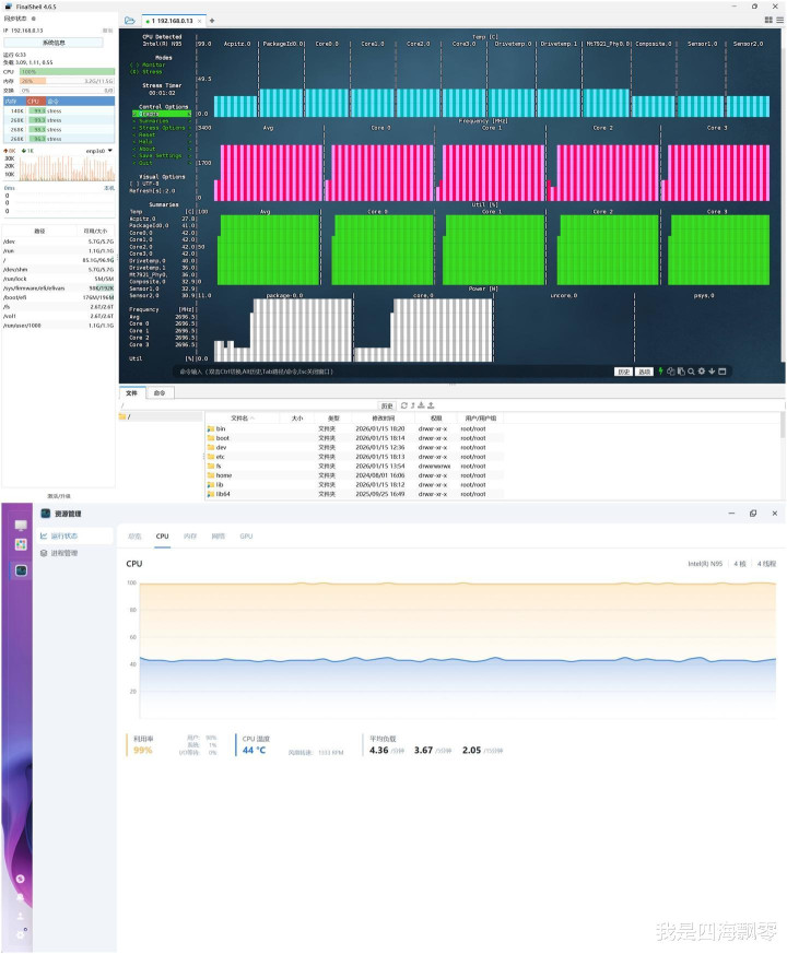 通过SSH造访飞牛 fnOS,期骗s-tui器具进行烤机测试,不错看到CPU还是是满载气象了,资源期骗率达到99%,此时CPU处理器的温度为44℃。