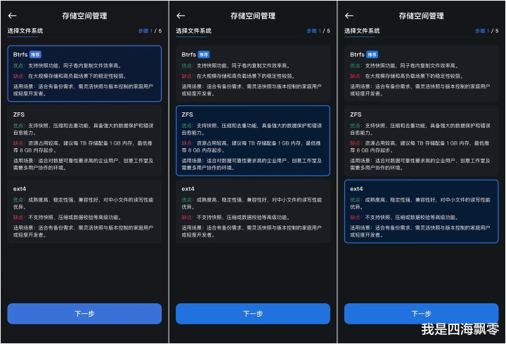 最令我惊喜的是,飞牛 fnOS系统现已相沿Btrfs、ZFS、ext4三种文献系统神色,并且官方还详备先容了这三种神色的优过失,这极少作念得非常东说念主性化。飞牛官方更推选使用Btrfs神色。天然,ZFS亦然一款相当值得取舍的文献系统,仅仅它对成立资源的占用相对较高;每TB存储容量需要配备1GB内存,官方最低推选8GB内存起步。因此,关于仅有8GB内存的NAS成立,不太提议使用ZFS神色;而内存达到12GB及以上的NAS,统统不错尝试这一神色。