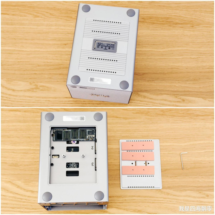 零刻 Me Pro的底部联想也十分奥密,橡胶脚垫内还避让了一把微型内六角扳手。只需取下这块橡胶脚垫,拧下两颗内六角螺丝,就能随便拆卸底部盖板。机身里面搭载了3 个M.2 NVMe 插槽,诀别相沿1个PCIe 3.0 x2规格和2个PCIe 3.0 x1规格的M.2 SSD。其中一号盘位预装了飞牛与零刻定制的128GB M.2 NVMe SSD,有益用作飞牛 fnOS 的系统盘。值得一提的是,底部盖板上还贴有M.2 SSD散热硅脂垫片,能有用提高固态硬盘的散热效力,保险成立万古期褂讪驱动。