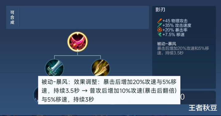 影刃被迫诊疗,不暴击普攻后加多10%的攻速,暴击后还是和原本的相通20%。合手续时辰减少0.5秒,把暴击后才加多的攻速给了常驻的10%后,攻速加成更踏实,减少的0.5秒合手续时辰无关宏旨,总体还是加强。