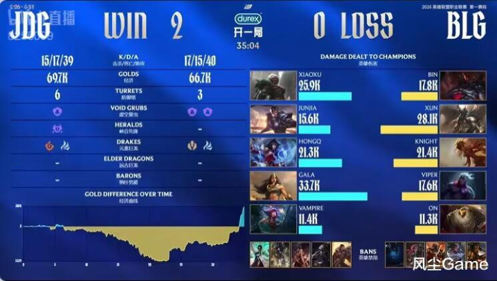第二把BLG前期依旧是上风,打到20多分钟,经济一度逾越5.4K,畴昔来说,这把是拿下了的,但Viper打得太差了,Poke流维鲁斯时间全空,团战十足没伤害,Gala轮子妈成长起来,BLG前排十足扛不住,终末惨遭翻盘,比赛35分钟为止,Viper伤害全场倒三,比自家开赴的塞恩还低。