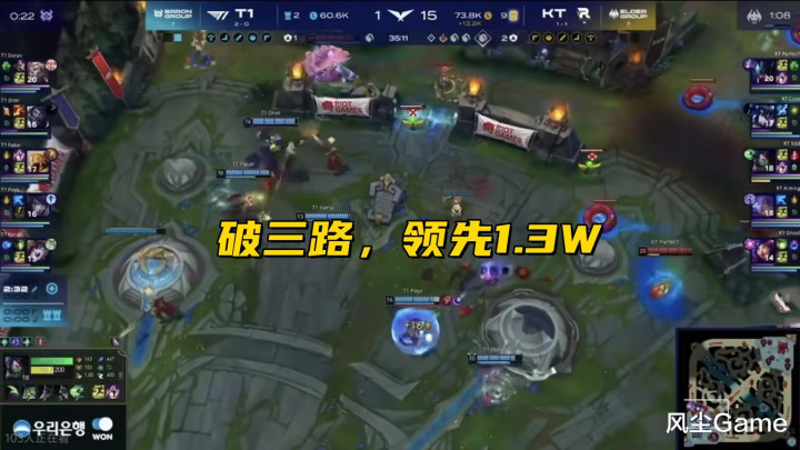 消灭天的另一场比赛,是T1大战KT,这场BO3天然是T1零封KT,但比赛本色异常精彩,第一把开局T1就打出雄伟上风,老李中路单杀BDD,下路双东谈主组也打出线杀,多兰对线缺点,被压了一些刀,但队友上风太大了,中下王人有线权,Oner猖狂控龙,才打到24分钟,T1就拿到了土龙魂。