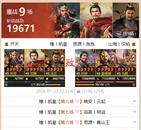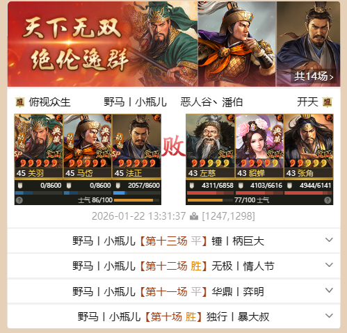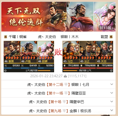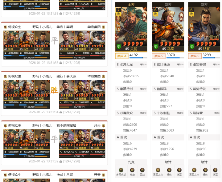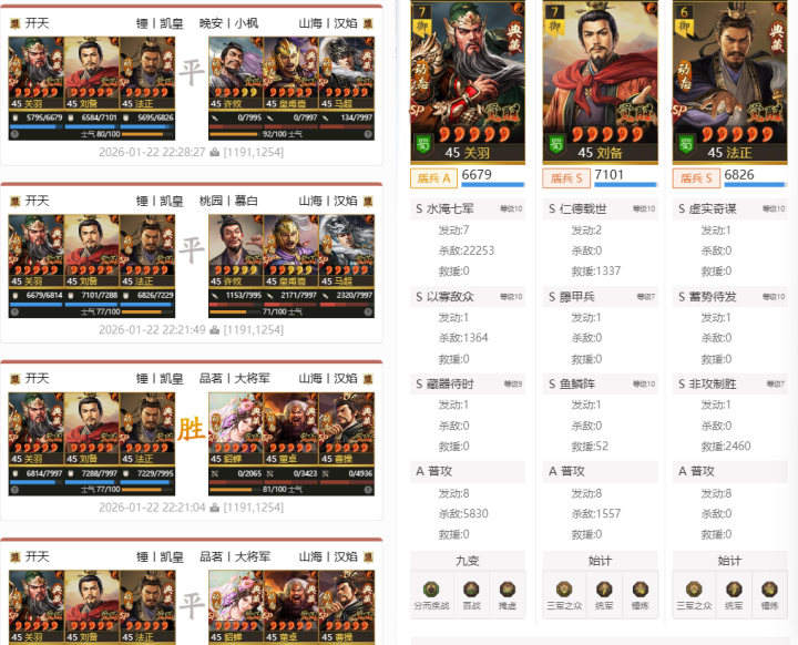另一只打出天下无双的声势,法官盾,sp关羽+法正+马岱,死战14场打出天下无双。