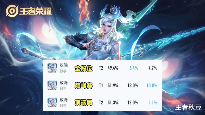 敖隐全段位胜率只消49.4%,登场率只消恻然的6.4%,主要原因是动作点券或限时点券取得英杰,领有者相对少,动作独一的四手段弓手英杰,上手难度比拟大,全段位数据不算出彩。然则到了妙手蚁合的巅峰赛,敖隐登场率飙升到18%,胜率51.9%,全弓手第一位,照旧在BAN率10.8%的情况下,否则登场率会更高。在尖端排位下, 胜率也有51.3%,处于发育路胜率前三。