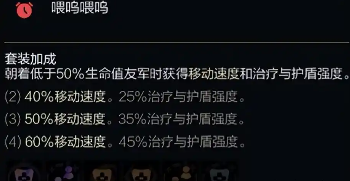 羁绊加成:朝着生命值低于50%的盟军移动时赢得移动速率,调整和护盾收尾加成。