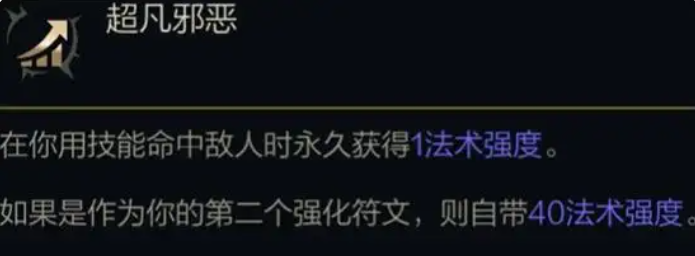 ·超凡泼辣:使用手段掷中敌东谈主后,始终赢得1点法术强度。若该强化符文为你的第二个遴选,将驱动自带40点法术强度。