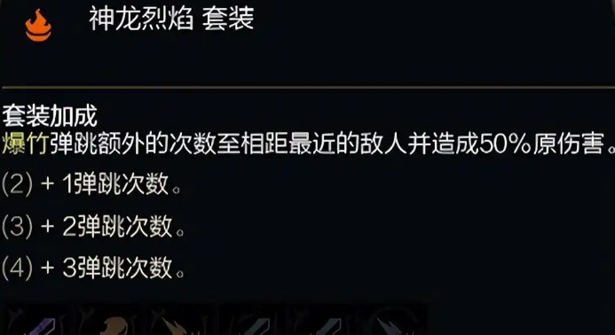 套装加成:炮竹弹跳独特的次数至相距最近的敌东谈主并形成50%的伤害