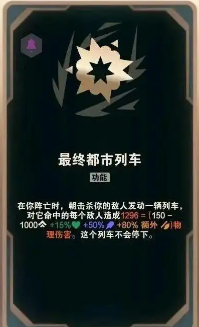 ·最终都市列车:你殉国后,将向击杀者辐照一列火车,对掷中的敌东谈主形成150-1000(+80%基础挫折力)(+50%法术强度)(+15%最大生命值)的物理伤害。(注:该收尾将纪录形成的伤害量、掷中英杰次数及击杀英杰数目。)