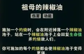 ·祖母的辣椒油:对敌东谈主施加灼烧收尾后,将在近邻生成一派辣椒油区域,合手续5秒。