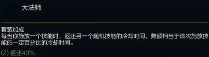 套装加成:每次你施放一个手段时,会以该手段冷却时间的百分比返还另一个随即手段