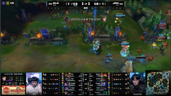 [15:30]GALA厄斐琉斯中路吃线被BLG四大壮汉逮捕,ON机器东说念主先钩GALA到手,Vampire锤石反钩ON于事无补,Xun拿到GALA东说念主头。