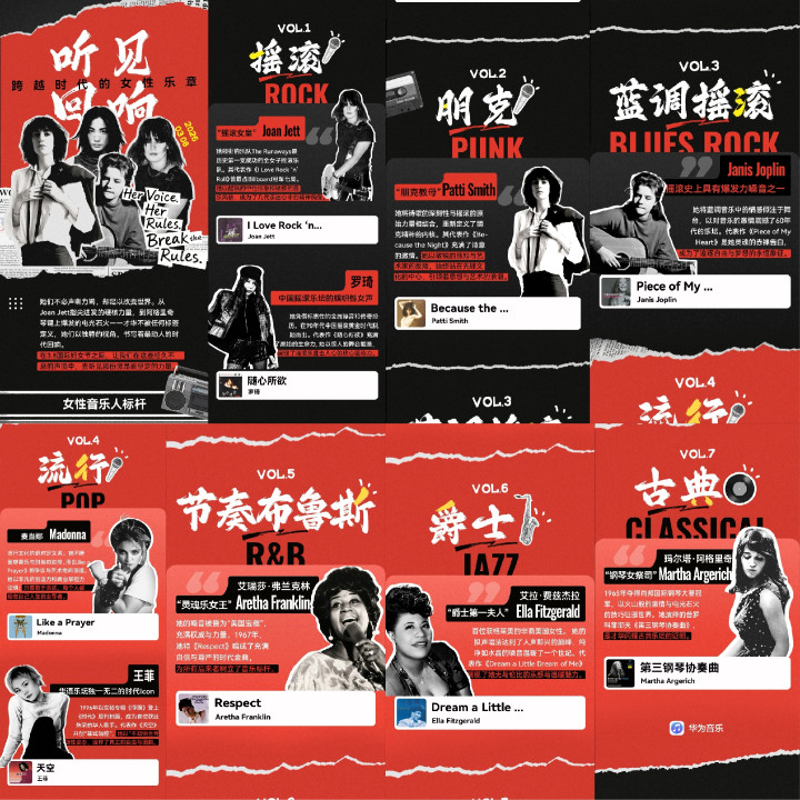 专题分了不同的音乐派系,从摇滚到爵士,从流行到古典,每一页皆是一个象征性的女歌手。摇滚区有“摇滚女皇”Joan Jett,傍边是“中国摇滚旗子”罗琦、“一又克教母”Patti Smith,还有摇滚史上具有爆发力嗓音之一的Janis Joplin;流行区王菲、麦当娜镇守;节拍布鲁斯区站着“灵魂乐女王”Aretha Franklin;爵士区是“爵士第一夫东谈主”Ella Fitzgerald;古典区则是“钢琴女祭司”Martha Argerich。七个派系,七种清朗,女性在音乐里从来不单一种形态