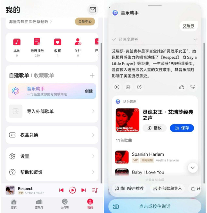 听上面了,念念多了解一下这位“灵魂乐女王”到底有多神。在华为音乐我的页面-自建歌单那边,掀开“音乐助手”输入她的名字。过了几秒跳出来一段先容,她不仅斩获19座格莱好意思奖,亦然首位入选摇滚音乐堂的女性歌手,大女主的强悍实力无需多言。底下还跟了一转保举歌单,我径直把歌单一键保存到我的自建歌单中反复轮回,每天听着这些“大女主东谈主生宣言”上班也更有能源了,服气我方也能像她们相同在我方的干事中闪闪发光。